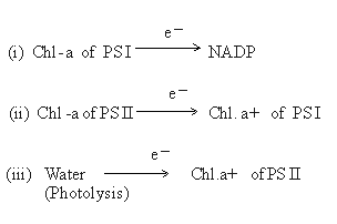 (c) Photolysis of water : The ionized chlorophyll-a+ of PS II is brought back to the ground state with the help of the electrons made available through the photolysis of water.