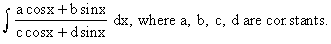 i.e. a cos x + b sin x = ( l c + m d ) cos x + ( l d - m c ) sin x. Equating co-efficients of cos x and sin x, we get \ a = (c + md) and b= (d - mc). By solving these equations, simultaneously, we obtain l and m. Putting these values in (1) we can write the given integral as :