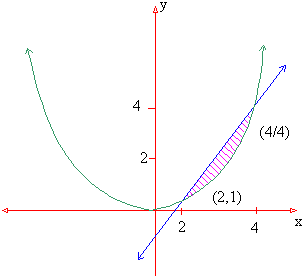 The points of intersection of the two are (2, 1) and (4,4). Therefore the required area enclosed between the straight line and the parabola is given by