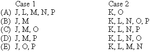 Two display cases, designated case 1 and case 2, are to be used for a display of fossils. The only fossils available are three large ones - J, K and L - and four small ones - , N, O and P. The display must meet the following conditions :