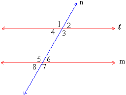 l & m are two parallel lines cut by a transversal n to form angles 1 to 8.