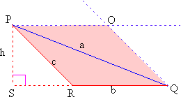 Just as the area of parallelogram was derived from the area of rectangle, the area of a triangle can be derived from the area of a parallelogram. Consider the triangle PQR (figure 4.4). If a line is drawn through P parallel to RQ and another line is drawn through Q parallel to PR they will intersect at O. POQR is a parallelogram with PQ as its diagonal.