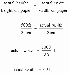 A 500 ft tall building is drawn as 25 cm tall on a paper. If its width is drawn as 2 cm what is the actual width of the building ?
