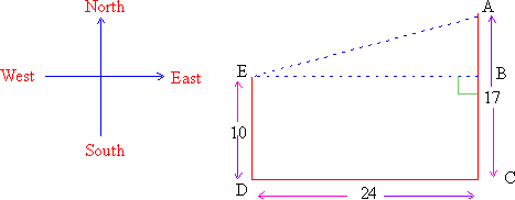 A man drives south along a straight road for 17 miles. Then turns west at right angles and drives for 24 miles where he turns north and continue driving for 10 miles before coming to a halt. What is the straight distance from his starting point to his terminal point ?
