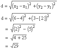 Using the distance formula determine the distance between the points with co-ordinates ( 4, -2 ) and (6, 3 ).