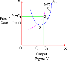 In Figure 35 we have Average and Marginal Cost curves of a firm. Marginal Cost curve intersects Average Total Cost curve at a minimum point. A rational profit maximizing firm is supposed to arrive at a point such as S and produce output Q. Since for smaller output levels Average Cost is still falling and for larger output levels Average Cost is rising, at initial point S Average Cost C1 = Price P. At price P a firm’s supply is Q. If a firm is required to make additional supply such as Q1 it will expect to cover its additional or Marginal Cost as S1 = C1. Supply will increase only when C1 = price P1 in the market i.aspsing.